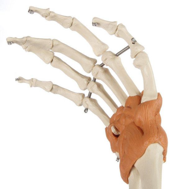 A premier quality joint model, unrivalled by any other in the industry, this arm and hand model is fully flexible and showcases a wide range of lifelike movements. The arm and hand joint will display extension, flexion, pronation and supination, and turning the hand shows parallel and crossed positions of the radius and ulna. High quality materials are used to replicate human ligament tissue, and will maintain their flexibility even after years of use. The model comes mounted on a stand, but is also removable from stand for advanced study. All bones are cast from original human specimens, providing incredible detail in all skeletal elements. Includes the lower portion of the humerus, a complete ulna, a complete radius, and a complete hand. Model measures 16.5 x 3.2 x 7.1 inches and weighs approximately 1 pound.