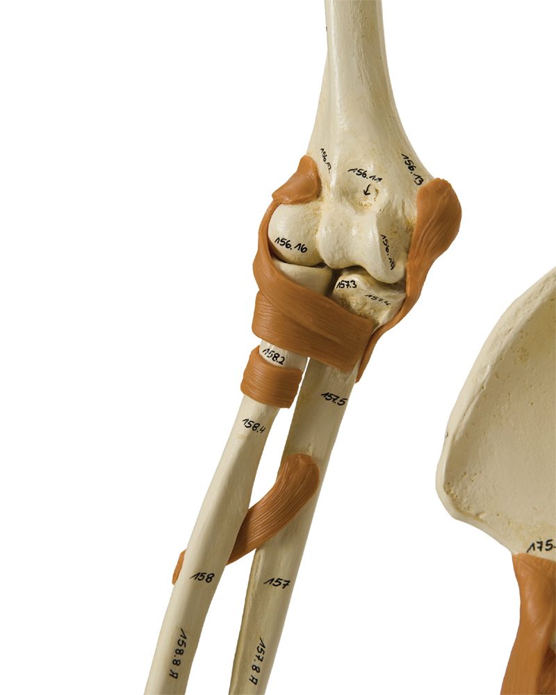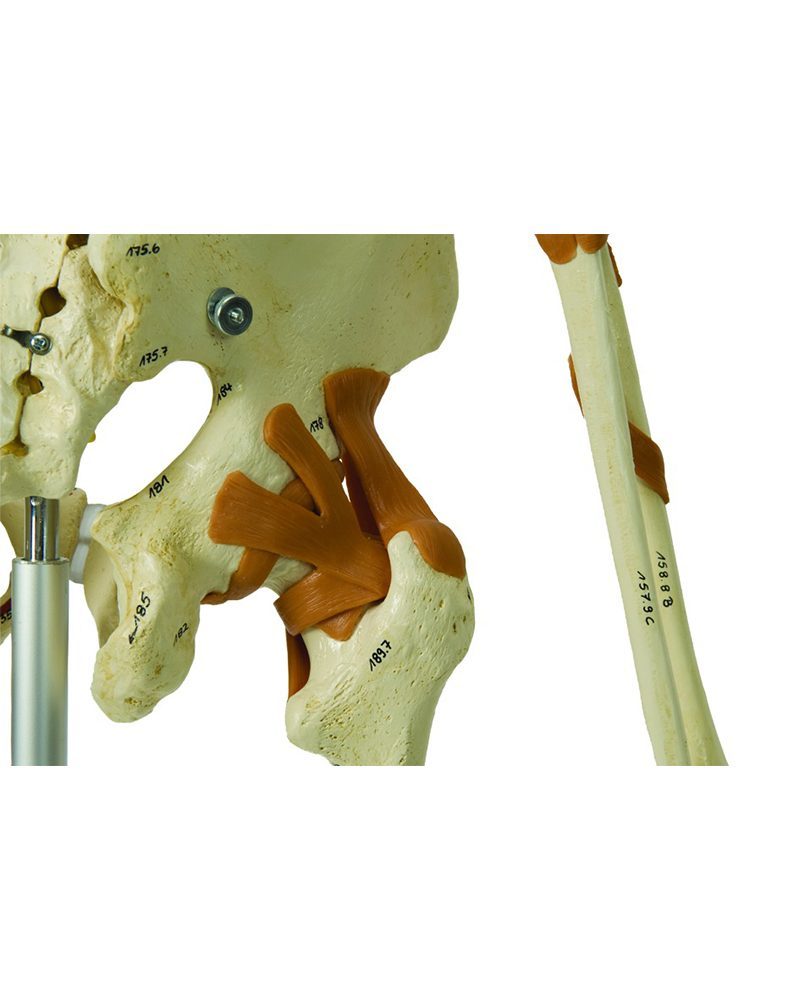 The Deluxe skeleton combines the advantages of the painted, flexible, and ligament skeletons with additional labelled and numbered features, and even adds head and neck muscles. It has a flexible spinal column and comes with a spinal cord, nerve ends, the spinal artery and herniated disc. There are approximately 500 painted, labelled and numbered muscle origins (red) and insertions (blue) and it comes with a comprehensive muscular numbering guide. It has flexible ligaments not only on the shoulder, elbow, hip and knee, but also on the hand and foot. More than 300 numbers are marked! They describe all the important anatomical details, bones, bony parts, sutures, fissures, foramina on an extra key.