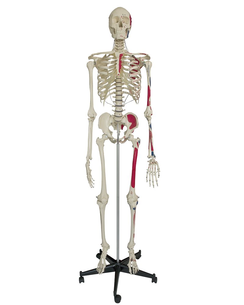 This advanced skeleton includes more than perfect replication of human bones - over 500 muscle insertion and origin points are individually hand-painted by German craftsmen with indelible paint for a lasting finish. Muscle insertion points are blue; muscle origins are painted in red. Includes a comprehensive numbered key for ease of study.
