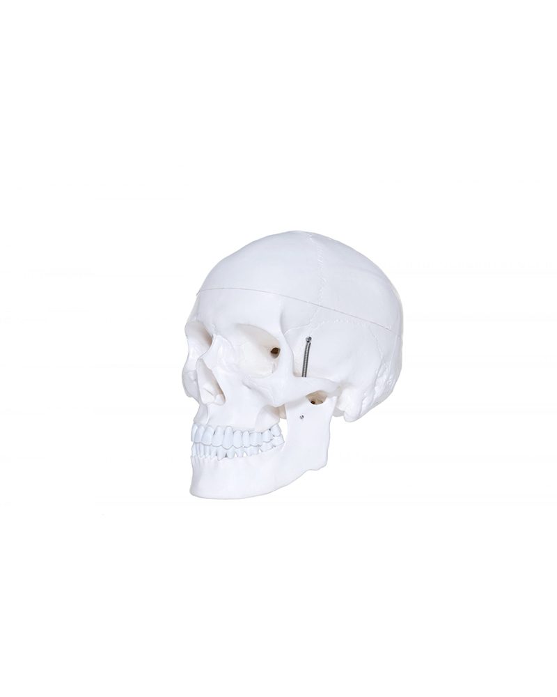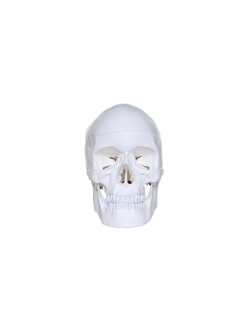 Classic 3 part human skull replica is well suited for basic anatomical studies. Includes sutures, foramen and styloid processes. The calvarium is removable and the jaw is on springs. Dissects into 3 parts.