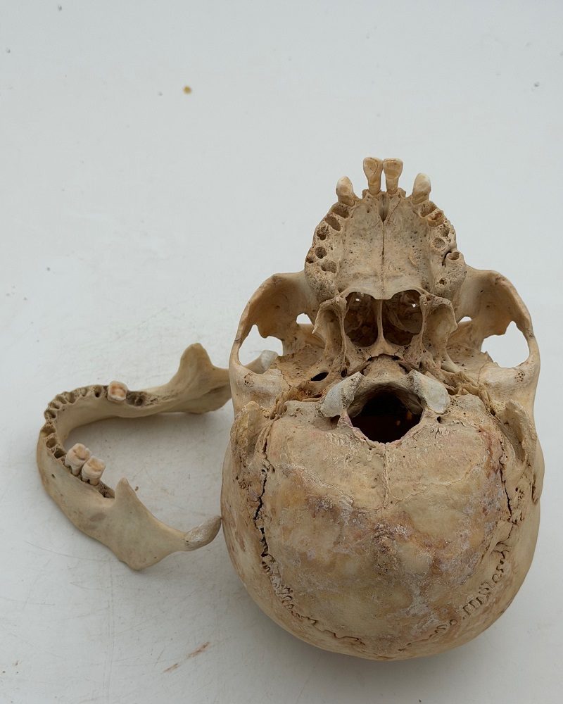 Natural bone Female human Skull 2 part (Calvarium and Mandible) with some dentition. 4 teeth present on calvarium, 3 teeth present on mandible. No cuts or hardware.