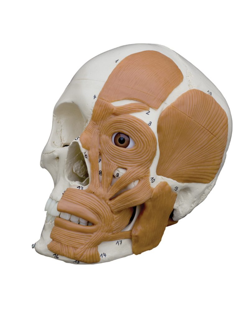 This is the only model worldwide that shows the main muscles of the head. All muscles are flexible and you can show for example the movement of the mandible while chewing.