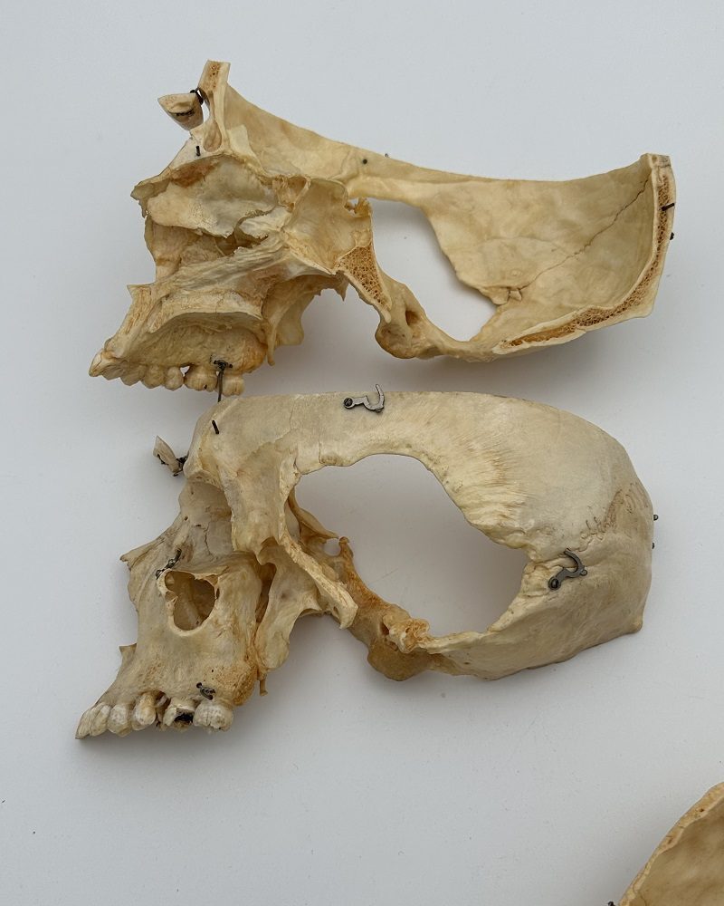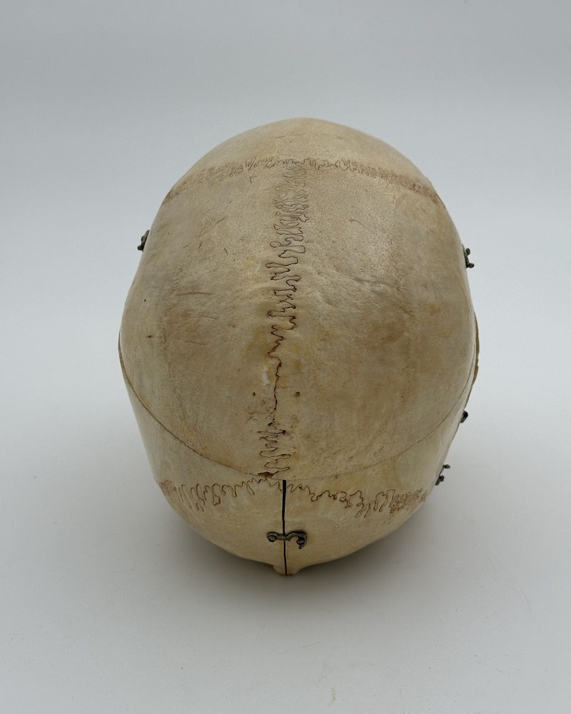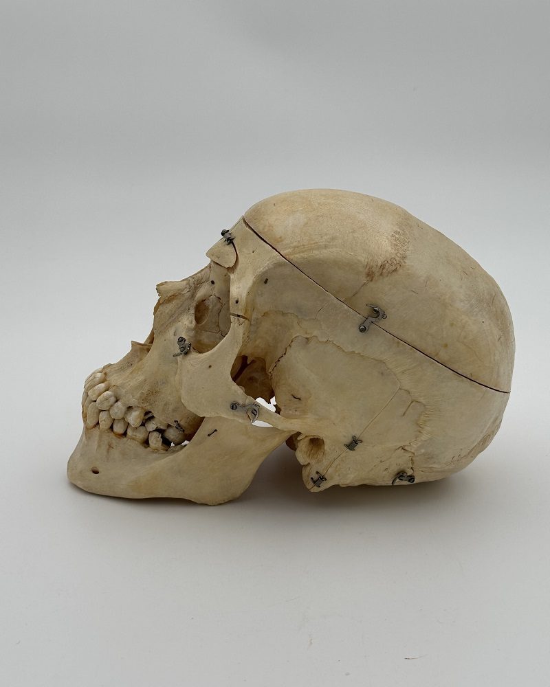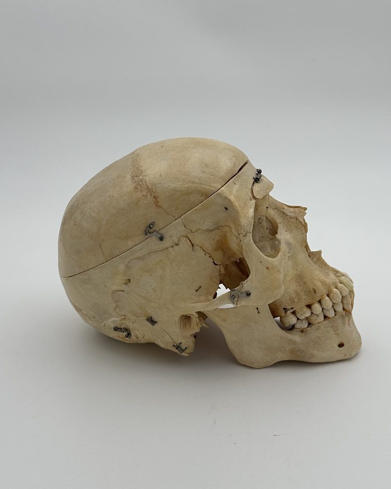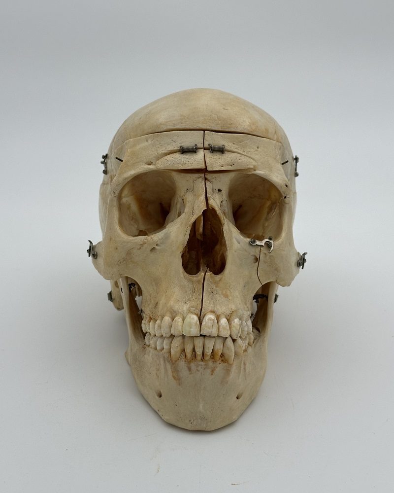Human Skull 10 part demonstration model, large male - parts consist of: mandible (1), calvarium cut horizontally(1), calvarium cut sagitally(2), left and right temporal bone removable and bisected (4), right zygomatic removable (1), left and right frontal sinus opening flap(2).