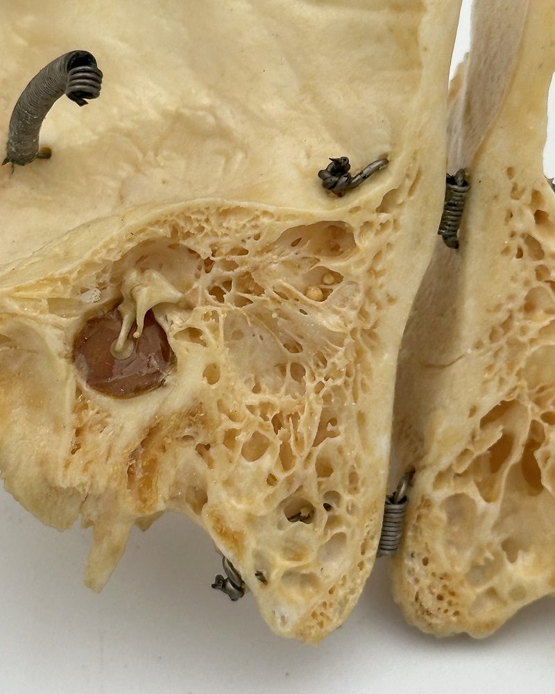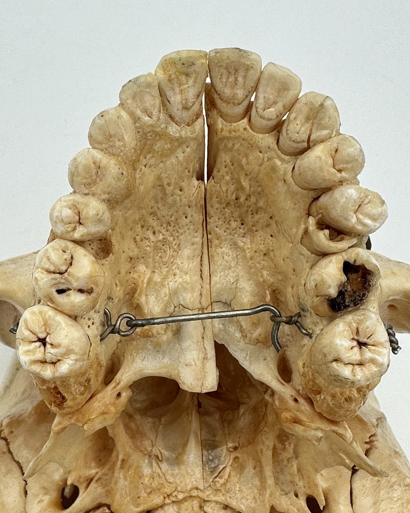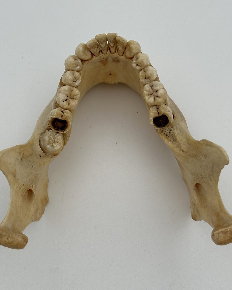 Inner ear showing ossicles. 15 teeth on mandible, both 2nd molars have large cavities. Unusual crowding on left maxillary molars, partial 1st molar fused into premolar.