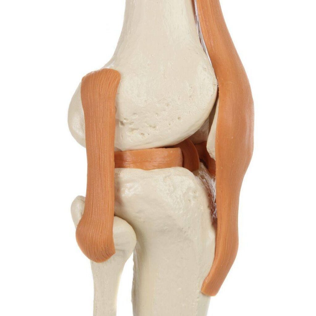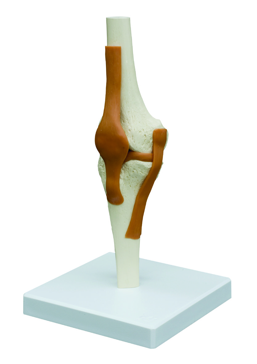 A premier quality joint model, unrivalled by any other in the industry, this knee model is fully flexible and showcases a wide range of lifelike movements. The knee joint will display extension, flexion, inside and outside rotation, and more. High quality materials are used to replicate human ligament tissue, and will maintain their flexibility even after years of use. The model comes mounted on a stand, but is also removable from stand for advanced study. All bones are cast from original human specimens, providing incredible detail in all skeletal elements. Includes the lower portion of the femur, upper portion of the tibia, and patella. Model measures 13.8 x 5.1 x 7.1 inches and weighs approximately 2 pounds.