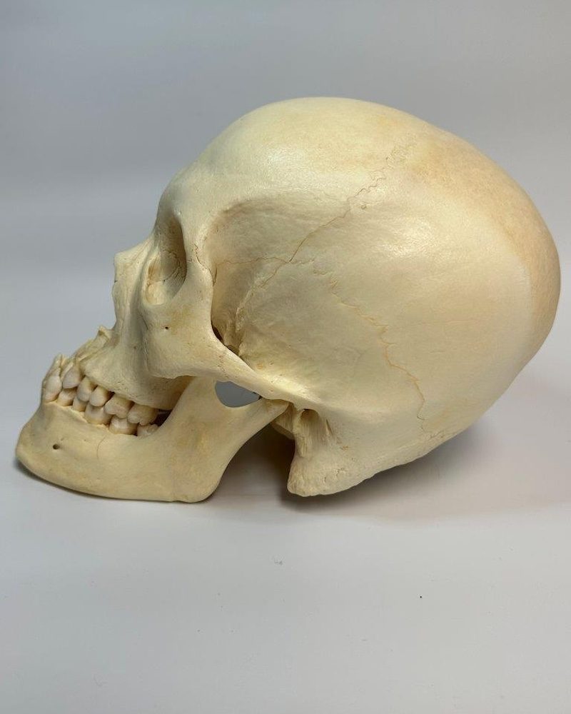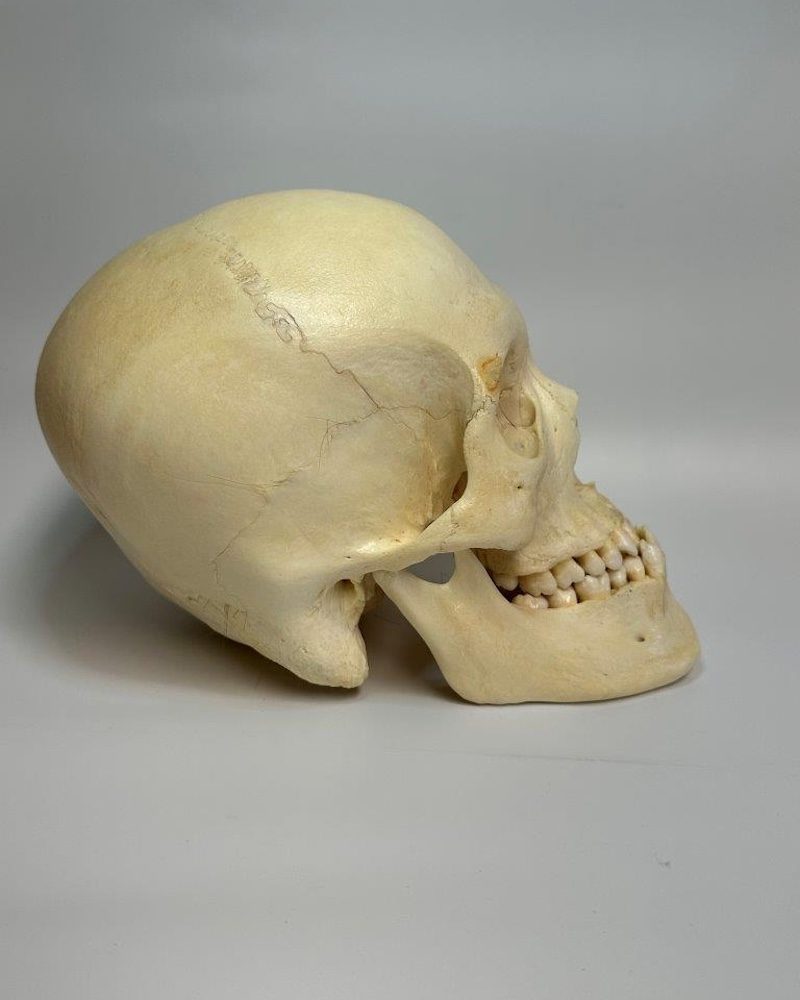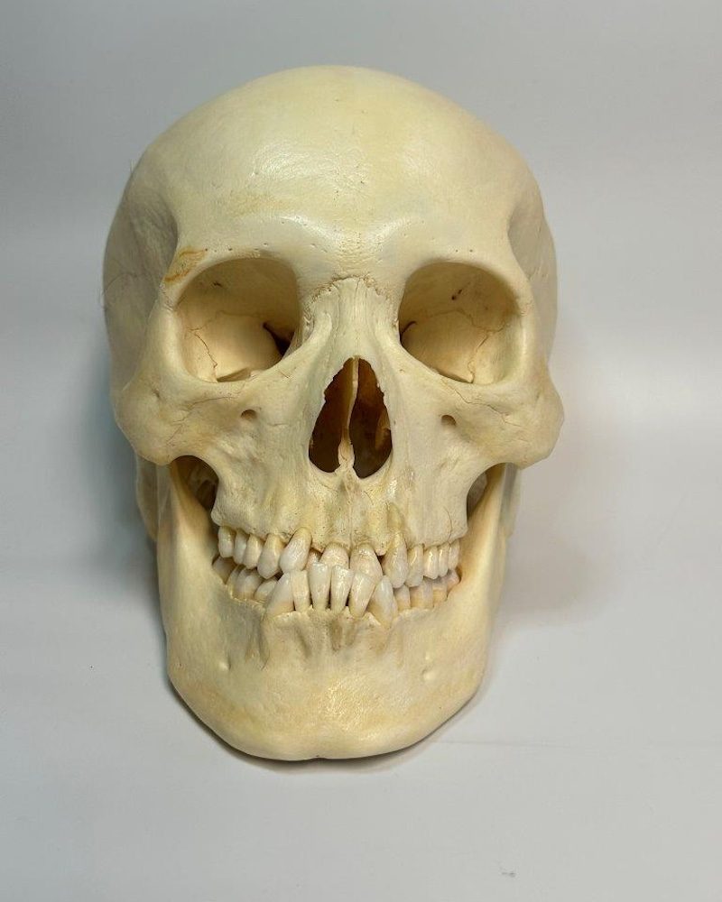 Male skull with extreme underbite - all 16 teeth are present on the mandible - 15 teeth present on maxillary with left 3rd molar slightly erupting. Left and right lateral incisors sit behind central incisors. Temporal sutures fused as well a portion of parietal sutures. General slight leaning to left side. No cuts or hardware.
