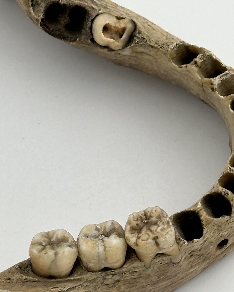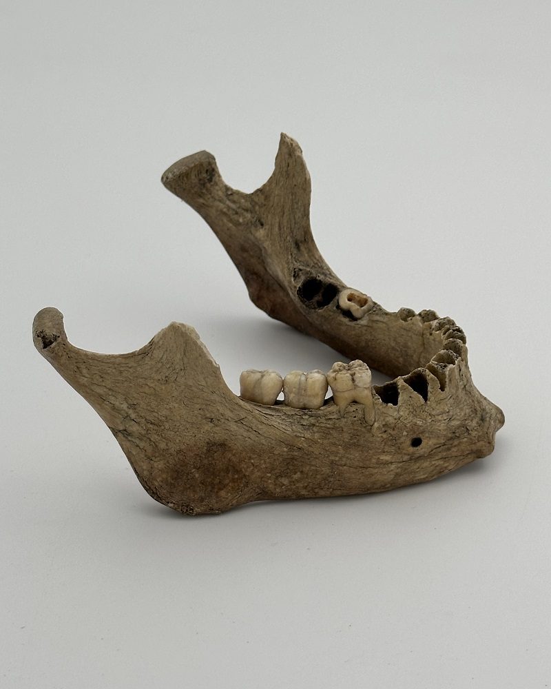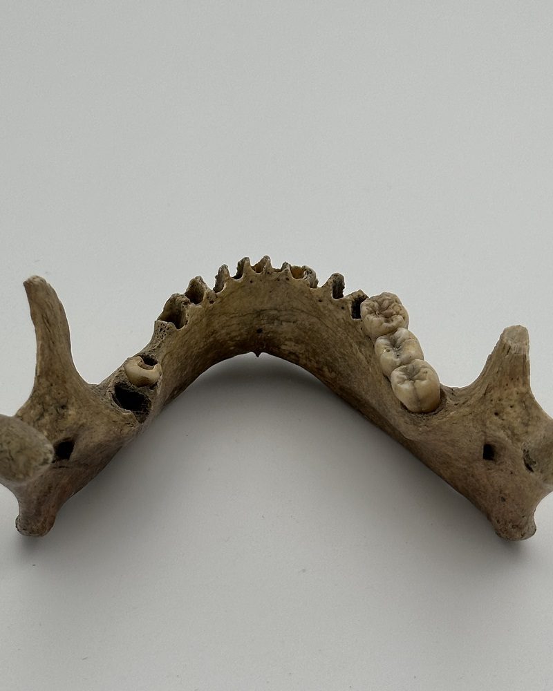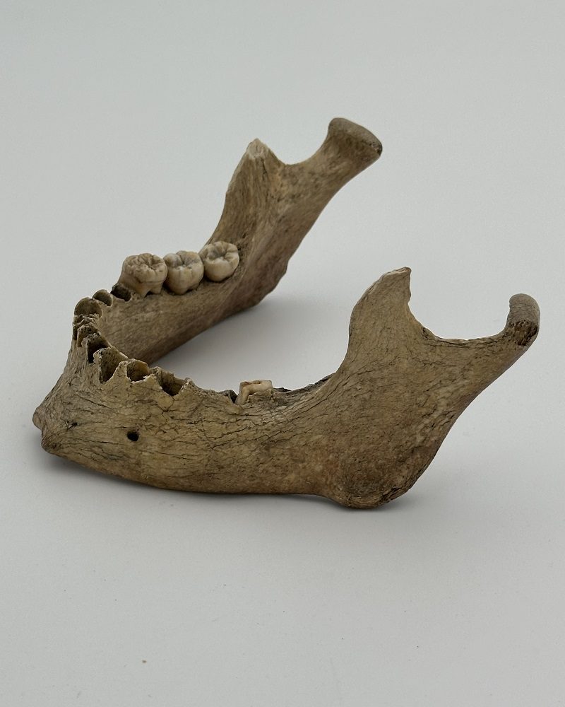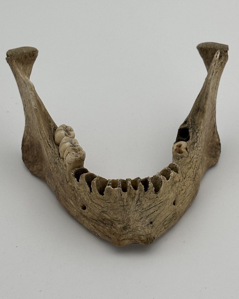 Very old mandible with 3 molars on the right side and 1 broken 2nd molar on the left side. Right coronoid process broken.