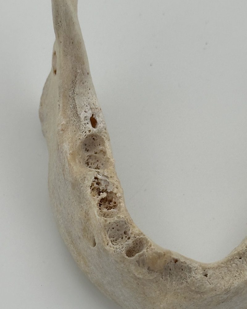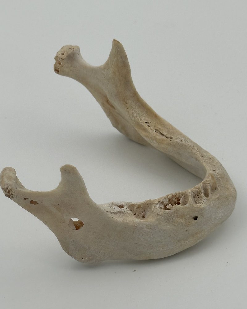 Mandible with no teeth, small hole on the right side, slightly porous in both left and right mandibular condyles.