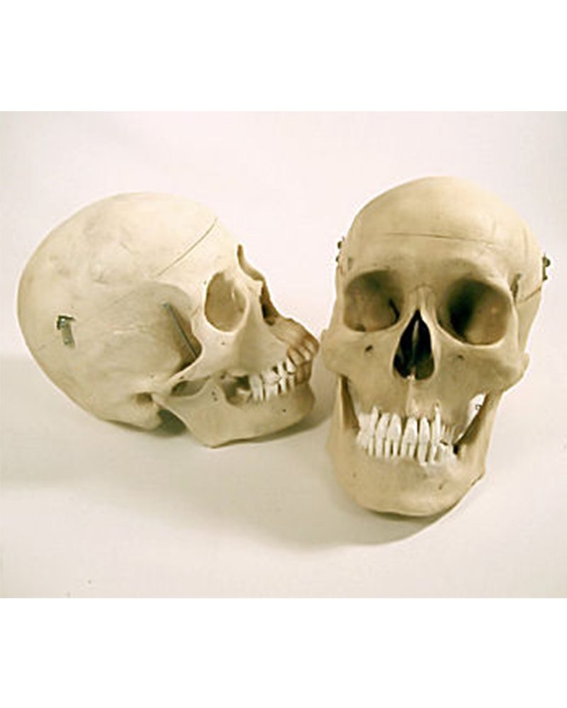 Generally has 0 – 2 teeth, there may be some damage in eye orbit or nasal area, styloid process may be missing. All major anatomical landmarks are intact. Available with calvarium cut or left as is. Mandible spring-held. Skull comes in corrugated box.