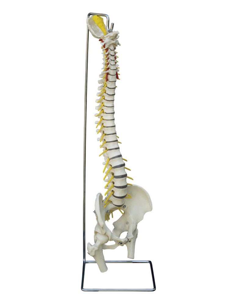Spine, Natural size (80 cm/32 inch). Lifelike accuracy cast from a natural spine. Spine is fully articulated and flexible to show vertebral movements and alignments. Comes with arteries, spinal cord, nerve ends and flexible femur heads. The sacrum is sectioned to show course of spinal nerves. With stand.